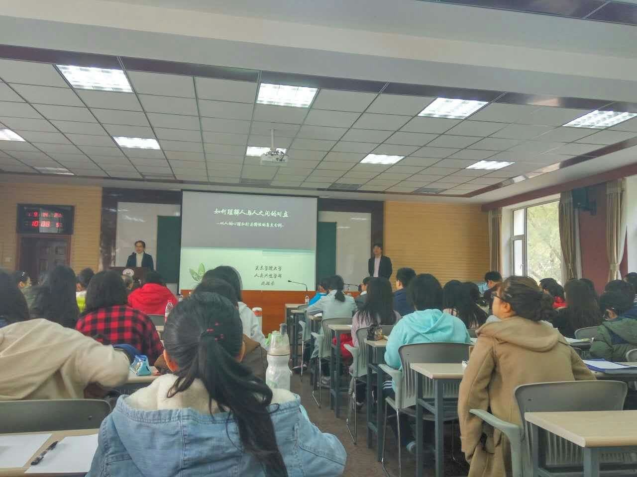 师生聆听了此次学术报告。施桂荣教授从以日本关东学院大学的学校概况和学校所在地横滨市为引题,指出人们在家庭、学校、职场中都无法避免沟通上对立,进而对“沟通的过程及要素”“沟通中的误解、沉默及其发生的心理机制”“沟通在认知、价值观和情感上的对立及其消除措施”三个方面进行了深入的分析。施桂荣教授报告直指生活中的现实问题,让学术接地气,使师生深受启发,引起了在场师生的共鸣和一致好评。