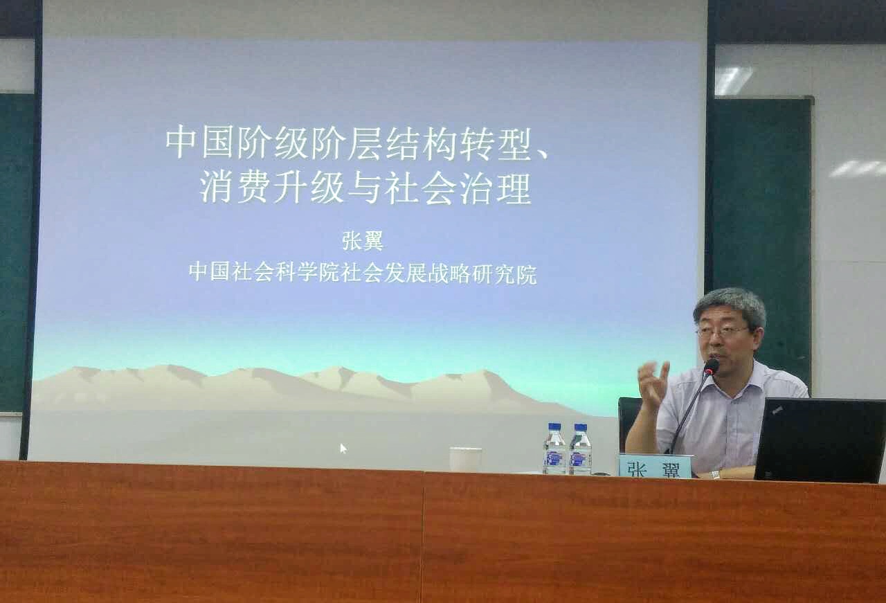 张翼研究员是中国社会科学院研究生院教授、博士生;现任中国社会科学院社会发展战略研究院党委书记、院长,是工业社会学、人口社会学、家庭社会学、社会流动与社会融合等领域问题研究的专家和学科领军人物,对国有企业家族化、国有企业社会成本、就业与制度变迁、中国社会结构、中国社会流动、中国社会组织与社会治理等问题研究造诣颇深,曾多次参与国家社会发展战略与人口发展战略的研究和修订工作。讲授过程中张翼研究员理论联系实际,利用社会学专业性的大量数据,深刻阐明中国社会结构转型中阶级阶层的消费倾向。张翼研究员高屋建瓴,思想睿智,与学生互动频繁,现场气氛十分热烈,讲座中一次次受到在场师生如潮的掌声。