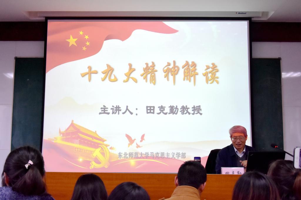 第一时间邀请全国马工程首席专家田克勤教授做题为“十九大精神解读”的专题报告会。田克勤教授从新时代我国社会发展的历史方位、新时代中国共产党的历史使命、习近平新时代中国特色社会主义思想和基本方略、全面建设社会主义现代化国家新的历史征程四个维度展开,对十九大报告进行了系统的导读与深入阐释。除组织师生现场聆听讲座之外,九州酷游