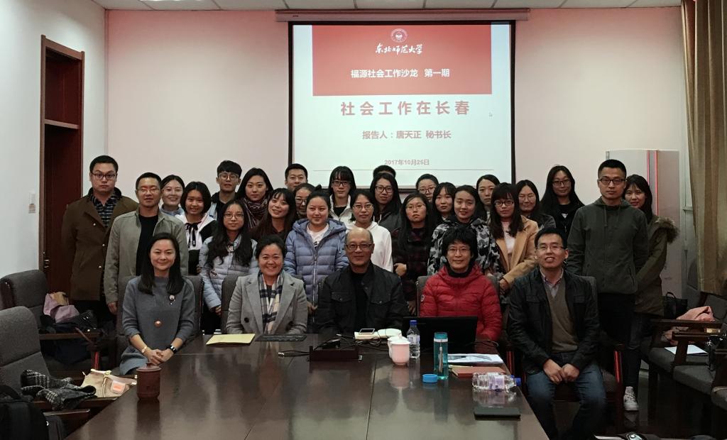 二楼会议室作了题为“社会工作在长春”的学术沙龙。唐天正是长春市社会工作者协会秘书长、中国社会工作联合会理事,中国社会工作联合会吉林培训中心副主任、吉林省社会学会常务理事、吉林省生命关怀协会副会长、民政部政策研究中心特约研究员,吉林大学等五所学校的兼职教授。著有《社工实务优秀案例》(吉林大学出版社);《从春到秋:社工日记精编》(时代文艺出版社);《伊水微光:社工示范项目文集》(长春出版社)等书;《中国后城市社会工作的发展路径》等论文。沙龙由社会学院书记朱兴涛老师主持,学院院长刘迟老师,李鸿老师、张凤荣老师、冯耀云老师、王嘉渊老师等师生约50多人参与了此次沙龙。