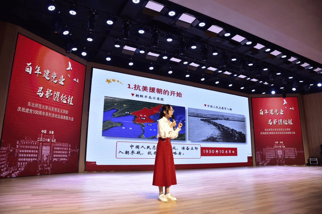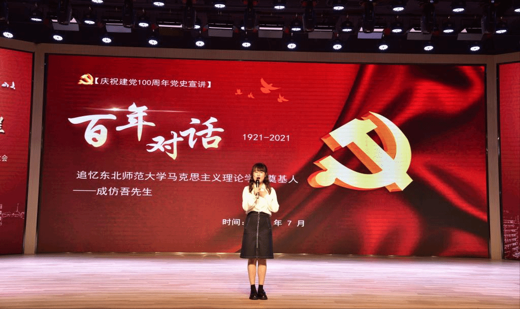 组织开展“百年党史百人讲,不忘初心竞自强”短视频献礼活动,“以讲促学,学以为讲”,围绕党和国家的重大历史事件、革命领袖与先锋模范人物的光辉事迹等,以身边人讲述党史故事,进而影响身边人的模式讲述荡气回肠的党史故事。本科生王梓涵同学作为短视频献礼活动的代表进行了现场“百人讲”党史展示,她从成老先生的人生信仰、唯一走完二万五千里长征的教授、以及创建东北师范大学的开拓奠基几个角度生情并茂地讲述了无产阶级革命家、教育家、社会科学家成仿吾先生的事迹,令在场观众感受到老一辈革命家崇高坚定的信仰,更深刻地认识到东北师范大学的红色基因以及马克思主义理论学科的学科背景和历史底蕴。