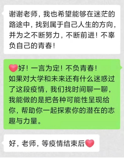 现在长春疫情严峻,你的家离学校很远,告诉家人,学校这个新家很安全。我觉得我还能帮助你更多,你的成长的需要、困惑以及思路或者专业学习方面,我随时欢迎你在疫情好转后,能多来我这里多聊聊天,喝喝茶!