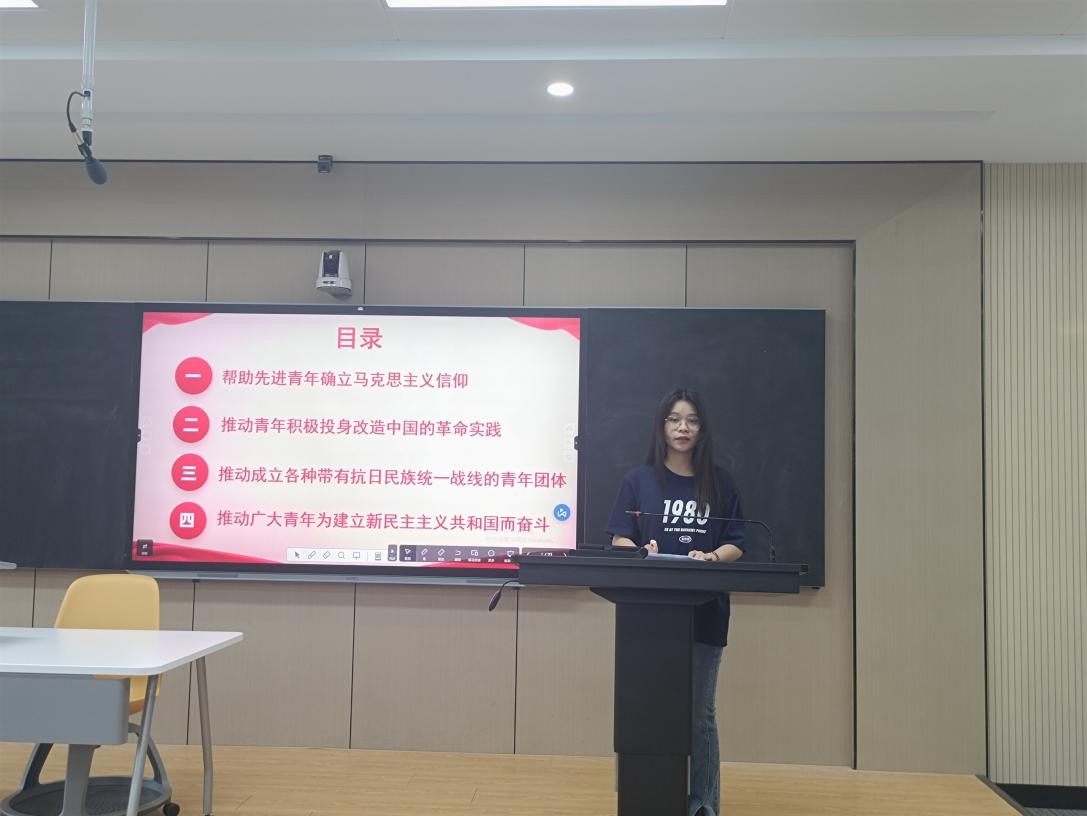 为探索救国救民道路,一群有志之士奋起抗战。李大钊、陈独秀和毛泽东等人在混沌中上下求索,随着十月革命一声炮响 ,他们开始接触、学习、接受、传播马克思列宁主义 ,逐渐从思想启蒙转向革命行动,倡导运用马克思主义指导中国实践,创建了中国共产党,使中国革命焕然一新。在黎丽莎同学的带领下,我们了解了新民主主义革命时期满腔抱负的有志青年的故事。