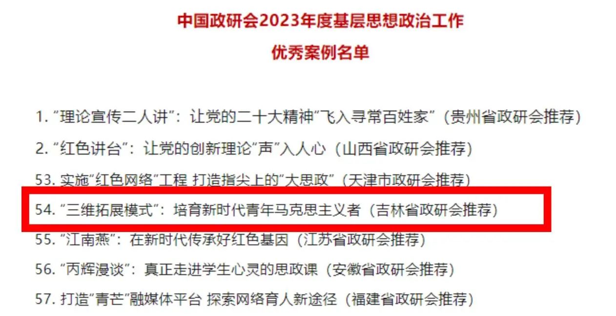 报送的《“三维拓展模式”:培育新时代青年马克思主义者》案例作为全国80个优秀案例之一入选,这也是吉林省唯一入选的案例。