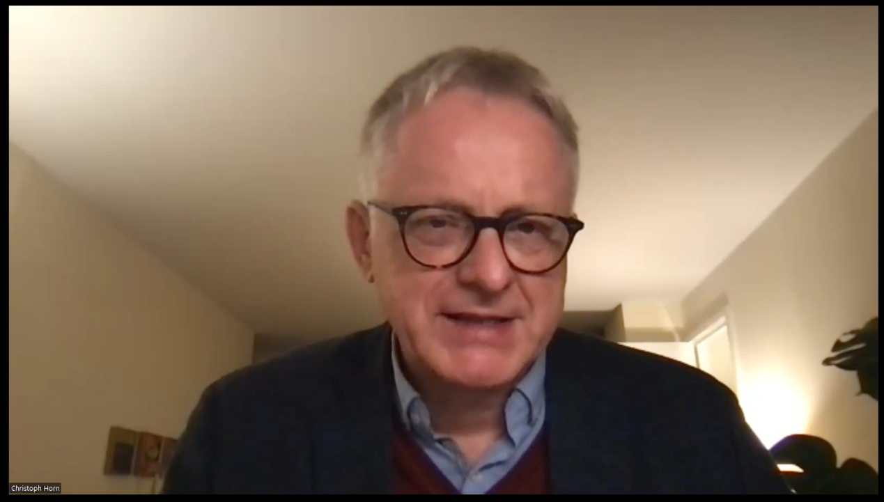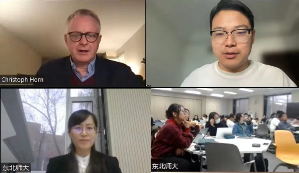 2023年11月22日,德国波恩大学教授、海德堡科学院院士、国际哲学学会(IIP)理事Christoph Horn教授应邀作客东北师范大学伦理学国际化工作坊,以“Kant’s Moral Philosophy: Merits and Demerits”为题为线上线下近100名师生进行了学术讲座。本次讲座由哲学院刘静副教授主持,复旦大学哲学学院青年副研究员贺腾评论,哲学院罗兴刚副教授、李守利副教授、陈荑馨博士参加。