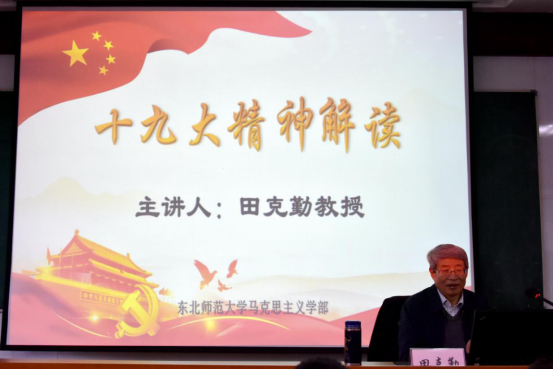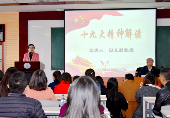 田老师首先指出十九大报告中亮点颇多,主要就我国进入了中国特色社会主义的新时代、中国共产党担负起了新的历史使命和形成了中国特色社会主义新的指导思想这三个亮点进行重点解读。