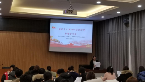 此次专题学习会由支部书记刘咏梅老师主持。刘老师首先带领各位同志回顾了改革开放以来历次党的四中全会的召开时间等基本情况、会议形成的各项决定及其重大意义,她指出四中全会在党和国家发展的过程中始终发挥着承上启下的关键性作用。刘老师还强调党的十九届四中全会对新时代持续推进改革开放、实现“两个一百年”奋斗目标的政治任务进行了战略部署,并呼吁同志们认真学习全会通过的相关文件,扎实自己的学理基础同时强化使命担当。此外,刘老师强调党支部要以党的十九届四中全会精神为引领扎实开展各项工作,一定要把总书记重要讲话精神和党的十九届四中全会精神学习好、领会好、贯彻好,要做到坚持学思践悟、学通弄懂、学以致用,真正用先进思想武装头脑、指导实践、推动工作,把会议精神切切实实转化为推动高质量发展的强大动力。