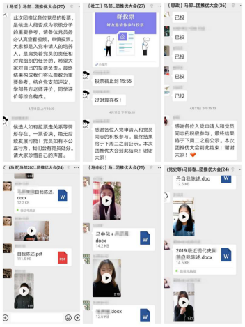 考虑到处于疫情期间,本次会议以微信群为平台,利用“群签到”和“群投票”小程序,分专业线上开展。会议于下午13:30正式开始。首先,在支委的主持下,参会人员通过“群签到”小程序进行签到;随后,各位入党申请人依次在微信群中发布提前录制好的陈述视频以及书面陈述稿;最后,拥有投票表决权的66名正式党员根据视频内容以及申请人的日常表现,在“群投票”小程序进行无记名投票。