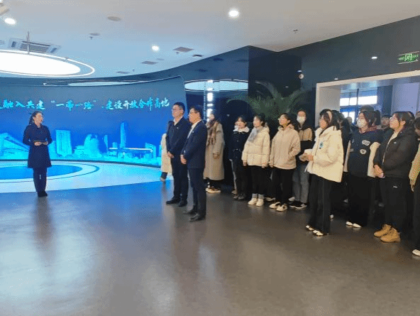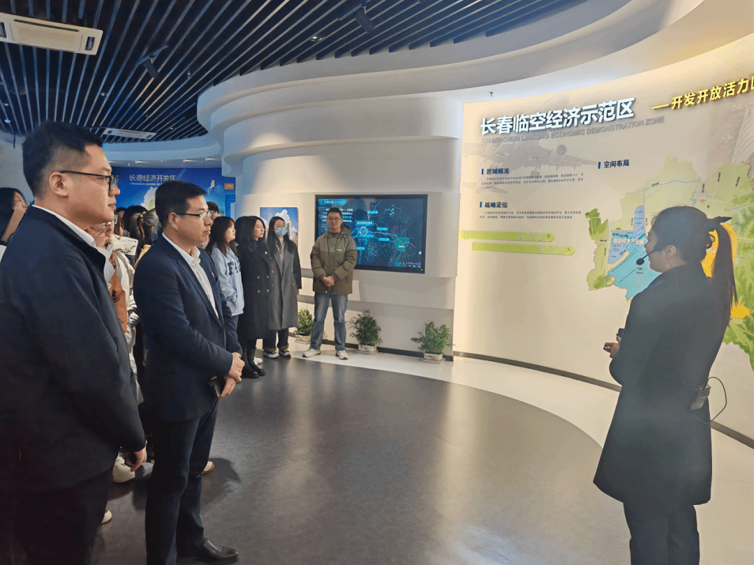 在长春新区规划展览馆,长春新区机关党委书记周丛红带领同学们重走总书记视察路线、重温总书记殷殷嘱托,介绍了长春新区发展规划和产业布局、区内明星企业和重点项目建设等情况。周书记表示,长春新区前景广阔、潜力巨大,诚挚欢迎同学们未来选择在长春新区就业创业,为新区高质量发展贡献青春智慧和力量。