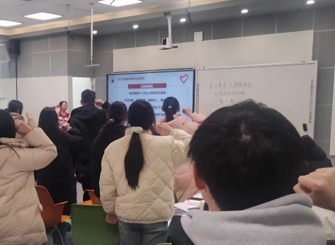 全体志愿者进行了庄严宣誓,分别由骨干志愿者雷鸿秋和朱馨冉领誓。为增进志愿者队伍凝聚力,本次培训班将80名学员划分成13个学习小组。在培训开始前,各小组成员充分交流,设计了本组队名、口号并上台展示。培训活动由骨干志愿者赵瀚韬主持。