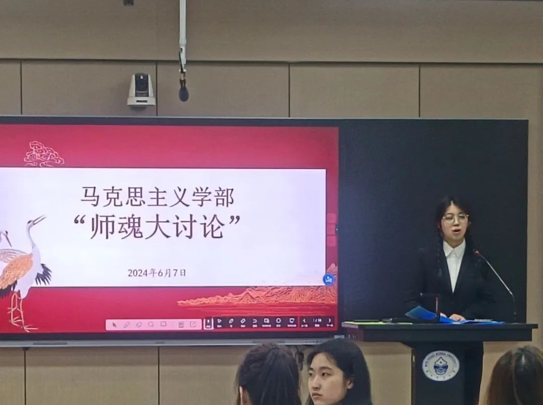 “师魂精神大讨论”环节中,14支团支部的代表分别分享了自己对师魂精神的感悟。其中,2022级本科生思想政治教育班团支部代表田佳威分享自己关于师魂精神的理解:“‘以德为先,以仁为范,以知为难,以爱为念’是对师魂师德的高度概括,也是教育工作者在日常教学和管理工作中应当遵循的原则。我们认为,这样的师德规范不仅适用于东北师范大学,同样也是全国乃至全世界教育工作者应当秉持的职业信条。百年大计,教育为本,教育大计,教师为本,教师养成,育德为本。要保持一颗爱学生的心。用的热情和耐心去引导他们,帮助他们实现自己的梦想。我们应该携起手来,共同培育和传承这份宝贵的师魂。让每一份热爱教育的心灵都能熠熠生辉,让每一份对知识的渴望都能得到满足,让每一份对梦想的追求都能开花结果。”
